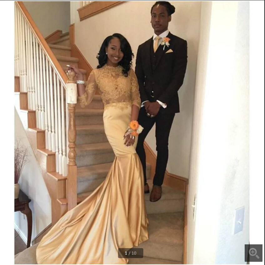 Best Price Vestido De Festa gold lace appliques mermaid evening dress 3/4 sleeve Saudi Arab High Neck Long prom evening gowns best selling Deals For