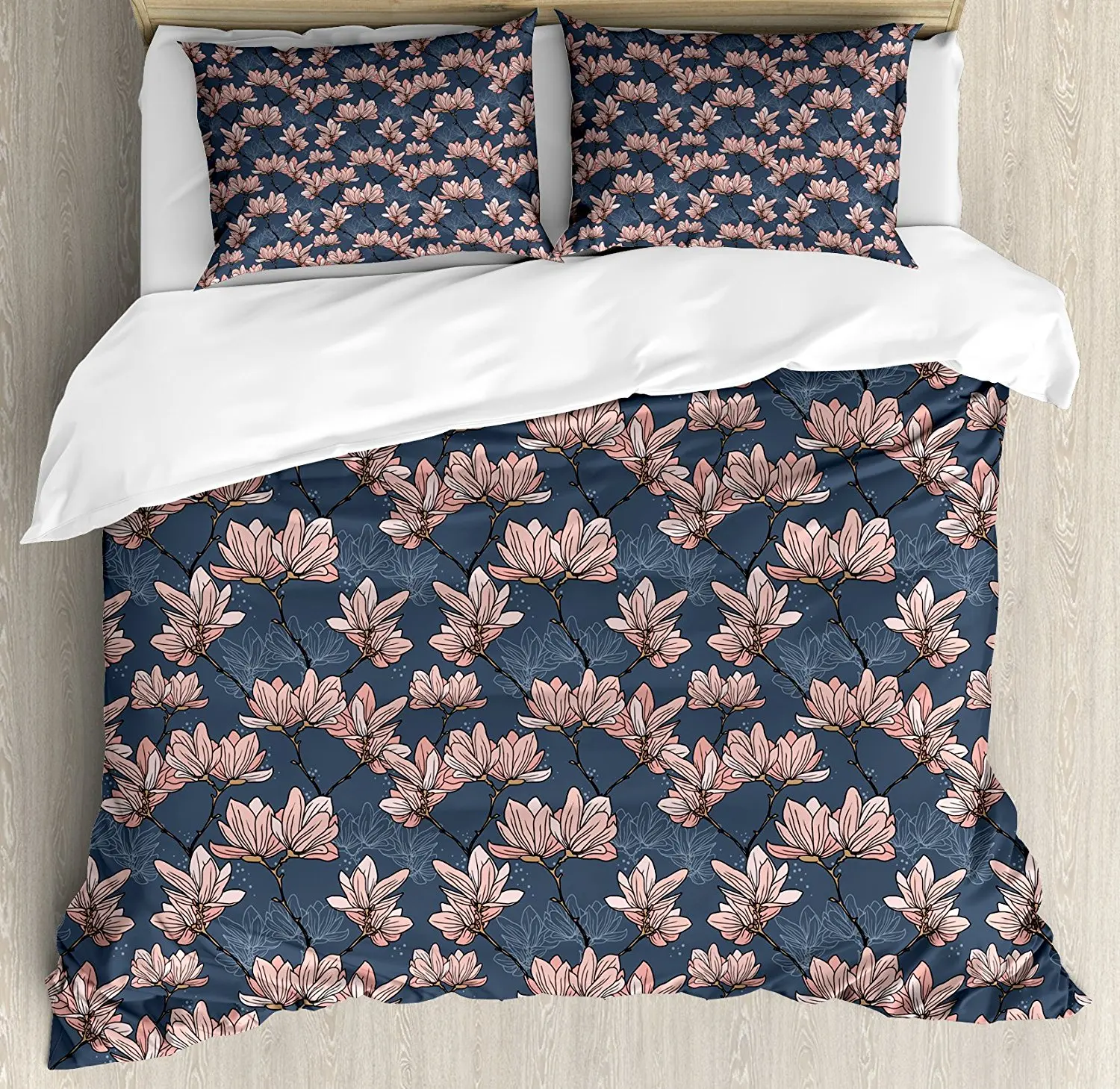 ^*Best Offers Flowers Duvet Cover Set Pattern with Magnolia Flowers in Japanese Style Tender Asian Nature Garden 4 Piece Bedding Set Low Cost