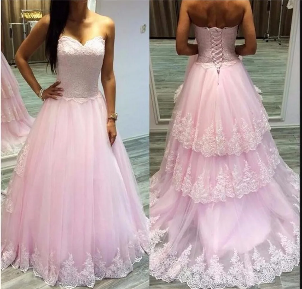 Best Price 2016 elegant pink a line lace appliques layered prom dress strapless sweetheart neck cheap prom gowns best selling Price Compare