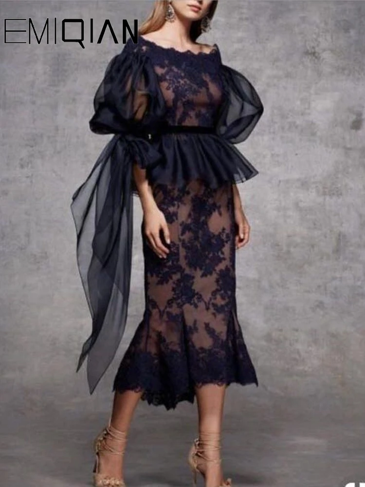 Best Price Best Selling Sheath Mother of the Bride Dresses with 3/4 sleeve Tea Length Elegant Lace Women Evening Party dress Get Cheap